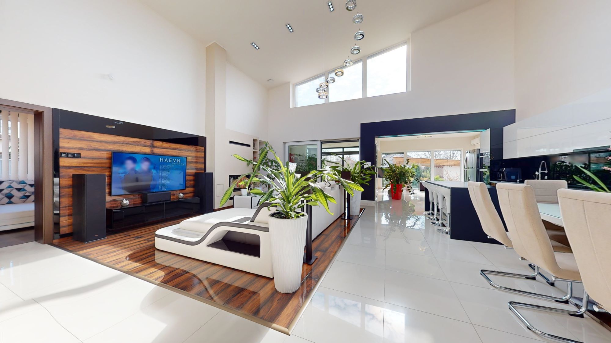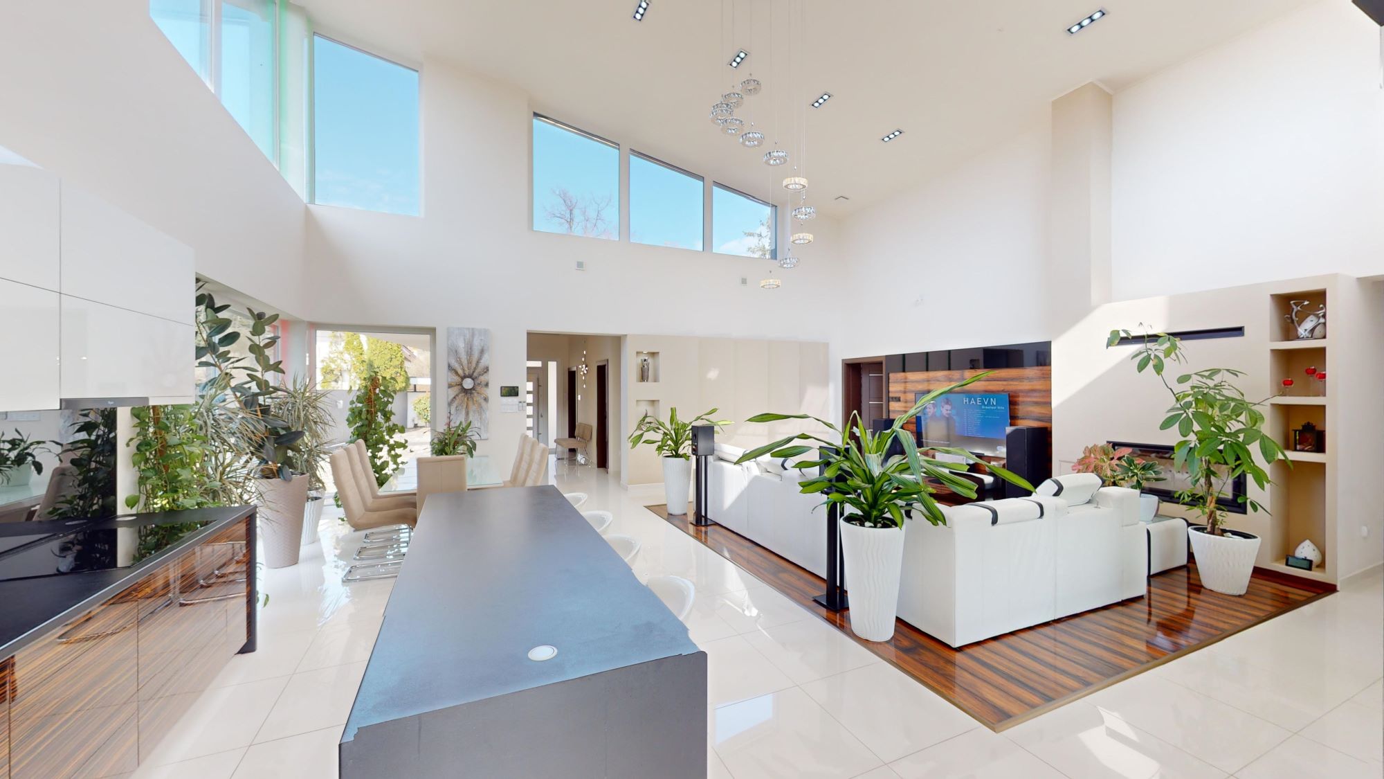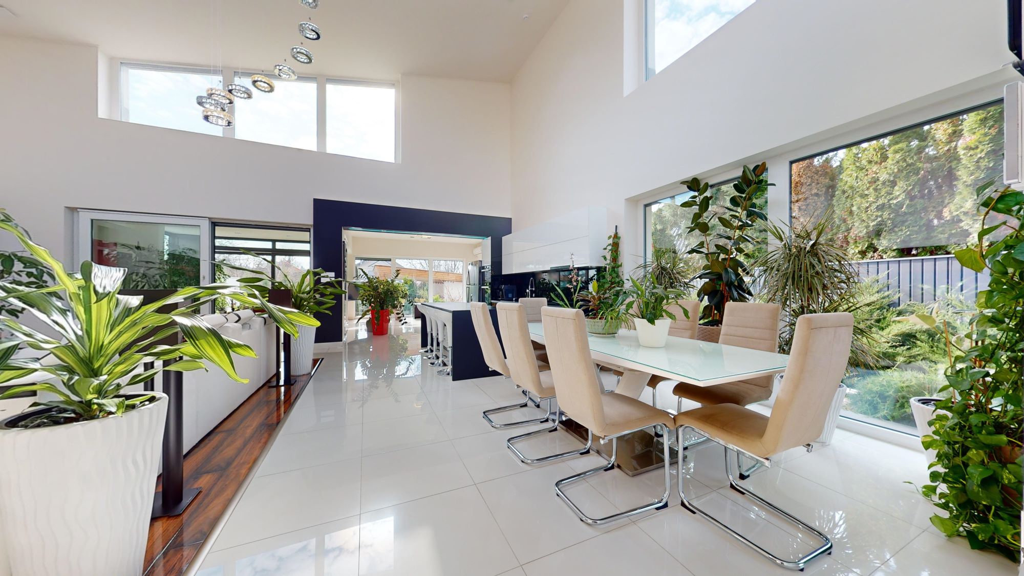 Az ingatlanba belépve az előtérből, egy 100 m2 alapterületű, fényáradatban úszó, 6,7 méteres belmagasságú nappali-étkező-konyha tárul elénk, mely a minimalista érzés minden luxusát és pompáját magában hordozza. Teljesen felszerelt, gépesített, egyedileg tervezett konyha a hozzá tartozó igényesen elrejtett spájzzal, tágas térelválasztó üveg tolóajtókkal bővíthető terek, melyben egy téli kert is helyet kapott. A nappali központi részén minden igényt kielégítően, egy fafűtésű modern kandalló, valamint egy egyedi tervezésű házimozi rendszer kapott helyet, melyet körülölel a Sofadreams által tervezett prémium bőrkanapé.