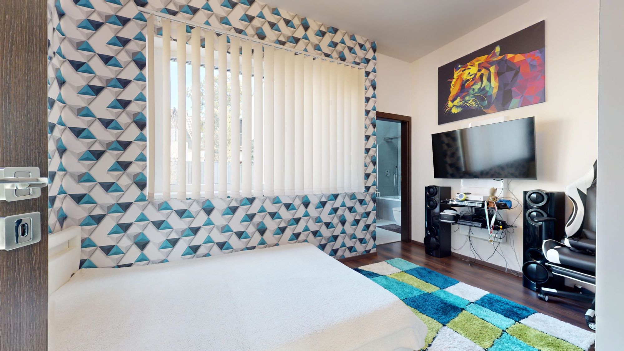 Az ingatlanban 4 hálószoba található, melyből 2 külön lakosztályként funkcionál, saját fürdőszobával, infraszaunával, gardróbbal, egyedi dizájn burkolatokkal, valamint az ingatlan egészére is jellemző wi-fi-ről irányítható egyedi ledvilágítással. Az előszobából nyílik egy külön fürdőszoba, mellékhelyiséggel, mely mosókonyhaként is funkcionál, valamint egy vendéglakosztály és egy dolgozószoba.